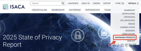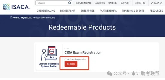 登录之后,在右上方找到“MYISACA”,显示下拉菜单之后,点击“REDEEMABLE PRODUCTS”,开始兑换您的考试资格。