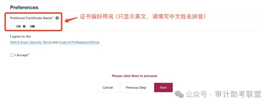 注意,请务必在“Preferred Certificate Name” 处正确填写您的姓名,该名字将体现在证书上, 建议按照英文格式填写您的中文姓名拼音(名字在前,姓氏在后),不可以填写中文 ,否则证书姓名处将显示为乱码。请仔细阅读相关政策与条款之后,在 “I Accept”,前面打“√”,并点击 “Next” 进行下一步。