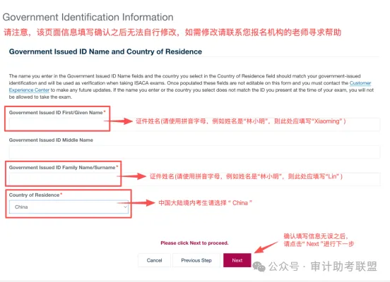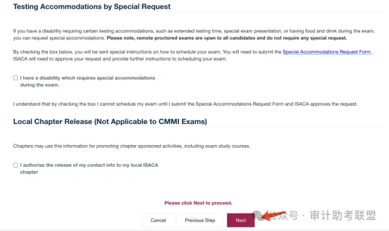 请勿勾选“I have a disability which requires special accommodations during the exam”。另外,目前中国只有香港分会与澳门分会,若您不希望把您的信息共享给所在地区的 ISACA分会,此处可以不做勾选,然后点击“Next” 进行下一步。