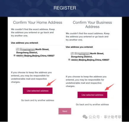 请在此处点击“Use selected address”,然后点击“Next”进行下一步。