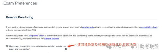 进入考试偏好选择的界面,请勾选下面截图中的阅读条款选项(请注意:受限于跨境互联网连通性问题,目前中国大陆地区的考生无法进行远程考试)。