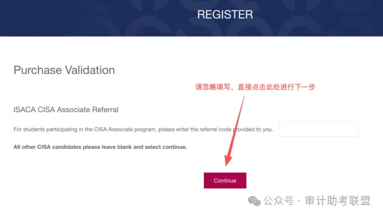 如果您不是“CISA Associate program”的参与者请忽略此处信息填写,直接点击“Continue”进行下一步。