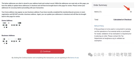 确认右侧“item” 显示应付金额为 “0” 之后,点击 “Continue” 进入下一步 。