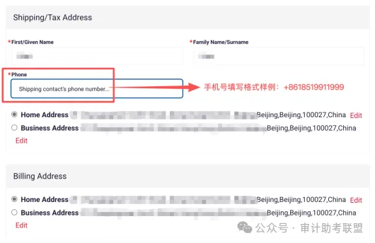 再次核对姓名拼写并按照截图中的格式样例(在您的个人常用手机号前面加上“+86) 正确填写您的联系电话,确认无误之后,请点击“Proceed to Billing”。