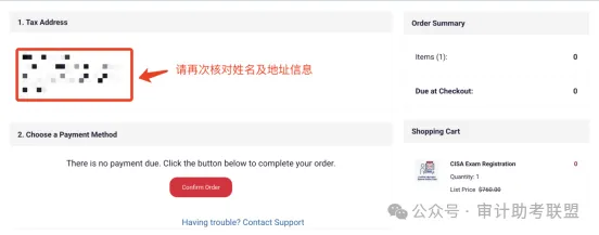 核对您的姓名和地址信息,如有问题请返回信息填报页面进行修改,若确认无误,请点击“Confirm Order”。